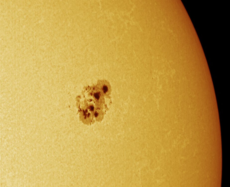 Sunspot group 10486, wide shot. In addition to the sunspots, the granules, caused by rising convection currents, can be clearly seen across the solar surface, especially in the upper right.